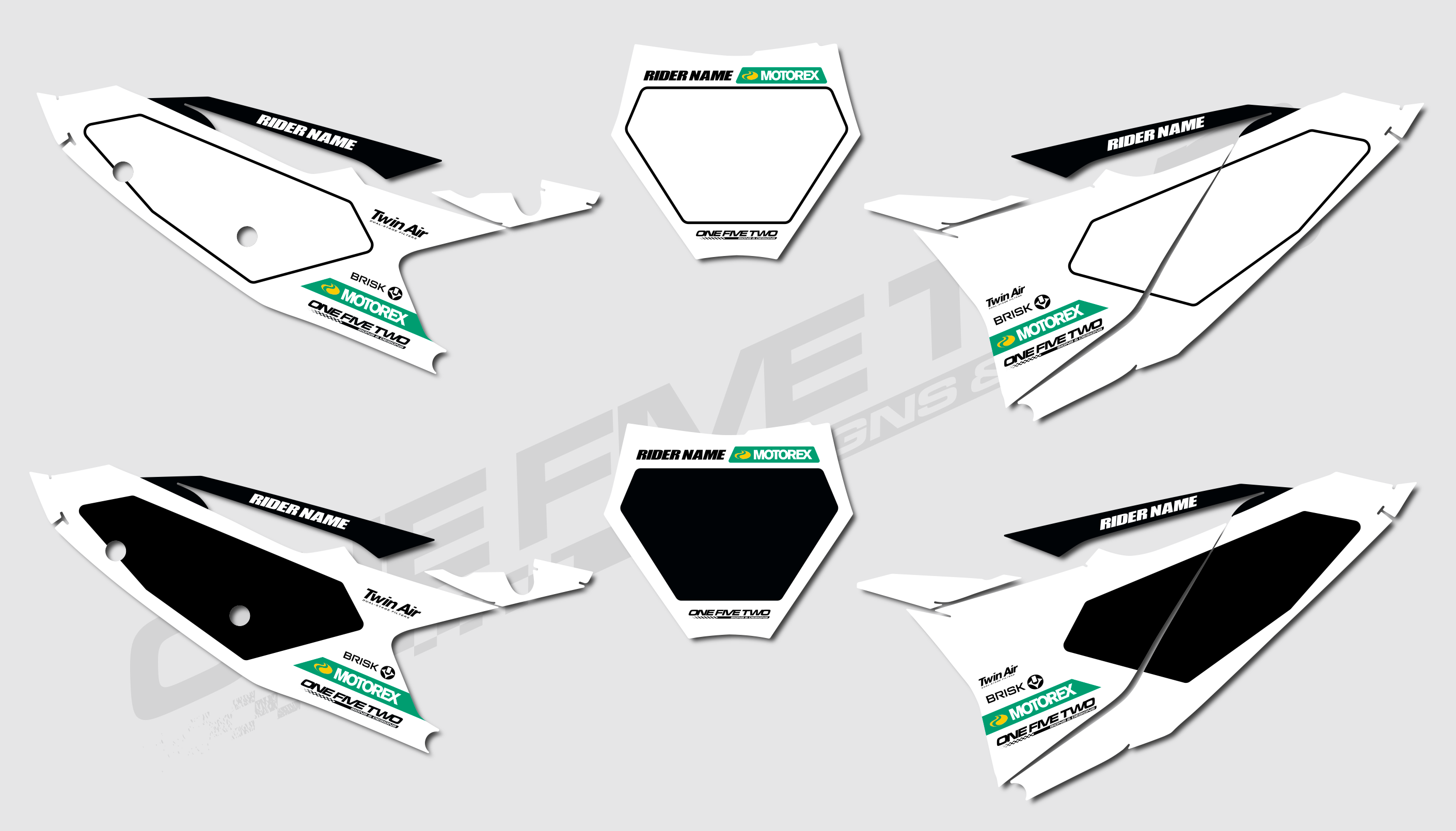 KIT INCLUDES: Backgrounds include printed graphics for both side panels and front number plate.